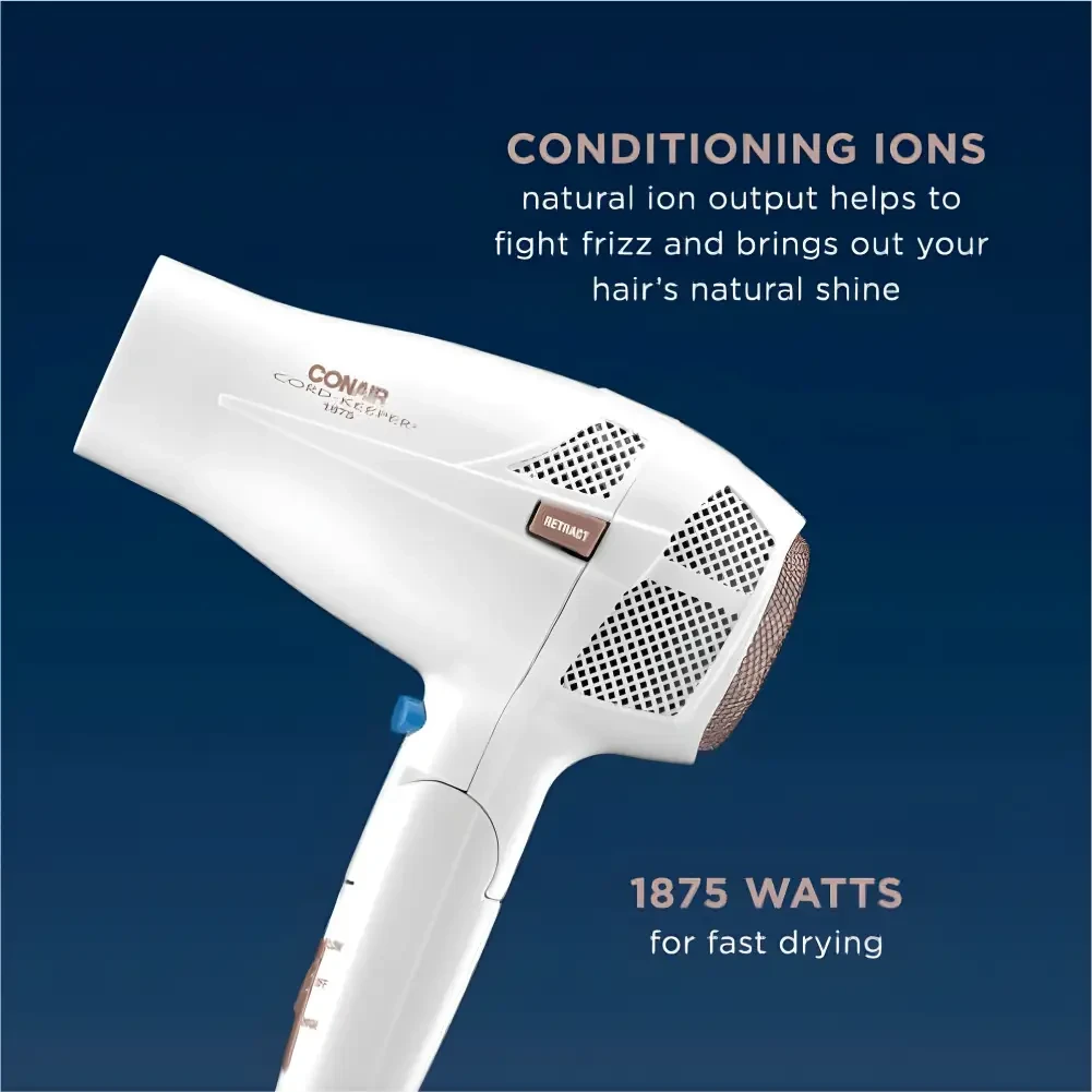 Achieve salon-quality hair at home with the Conair Hair Dryer. This powerful yet lightweight dryer offers fast drying with its 1875 watts of power. Featuring two heat and speed settings, it allows for customizable styling, while the cool shot button helps set your look for a long-lasting finish. The ergonomic design ensures comfort during use, and the built-in hang loop provides convenient storage.