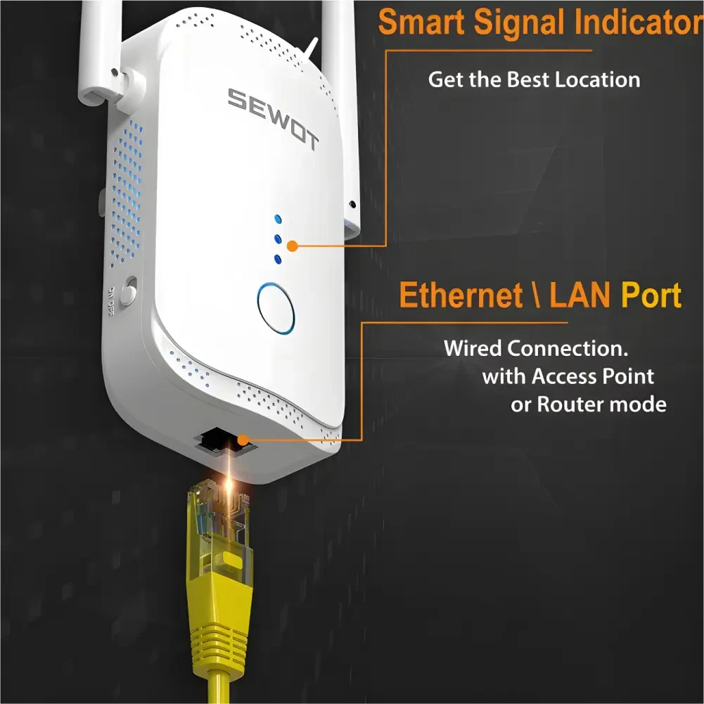 Boost your WiFi coverage with the SEWOT WiFi Extend, a powerful, easy-to-install range extender that eliminates dead zones and extends your WiFi signal to every corner of your home. Enjoy fast, reliable connections for streaming, gaming, and browsing with speeds up to 1200 Mbps, dual-band support, and compatibility with all standard routers.