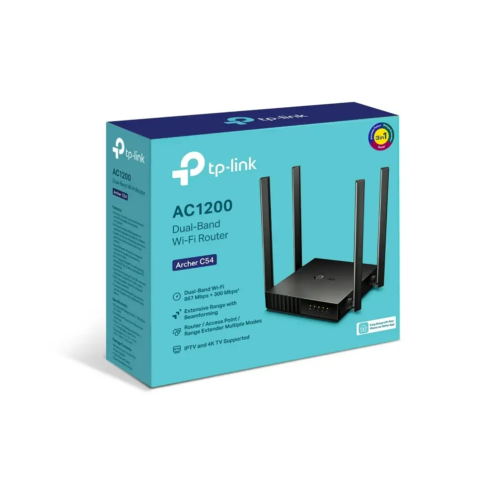 The TP-Link Archer C54 is a high-performance dual-band Wi-Fi router designed to deliver fast and reliable internet speeds for all your devices. Perfect for streaming, gaming, and everyday browsing, this router features a sleek design with cutting-edge technology to ensure a stable and secure connection throughout your home.